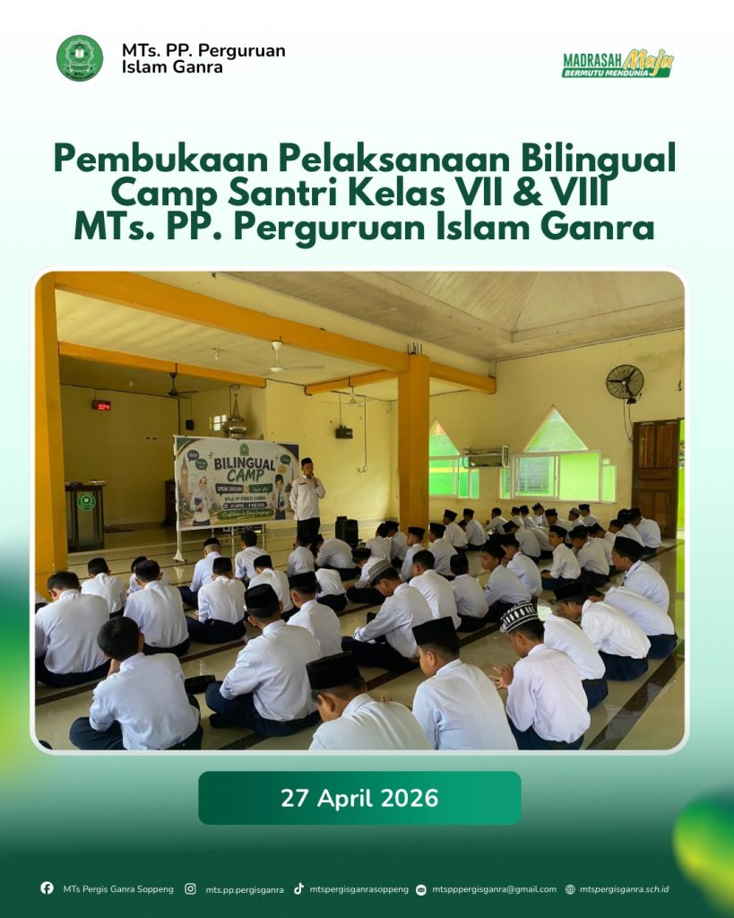 MTs. PP. Perguruan Islam Ganra resmi membuka kegiatan Bilingual Camp bagi santri kelas VII dan VIII pada 27 April 2026. Kegiatan ini dilaksanakan bertepatan dengan pelaksanaan Ujian Madrasah (UM) kelas IX, sebagai upaya mengisi waktu dengan aktivitas yang edukatif dan bermanfaat.