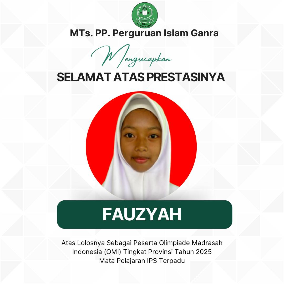 Alhamdulillah, kabar membanggakan datang dari MTs. PP. Perguruan Islam Ganra! Salah satu santri terbaik kami, Fauzyah, berhasil lolos dan melaju ke tingkat provinsi dalam ajang Olimpiade Madrasah Indonesia (OMI) 2025 pada bidang Ilmu Pengetahuan Sosial (IPS).